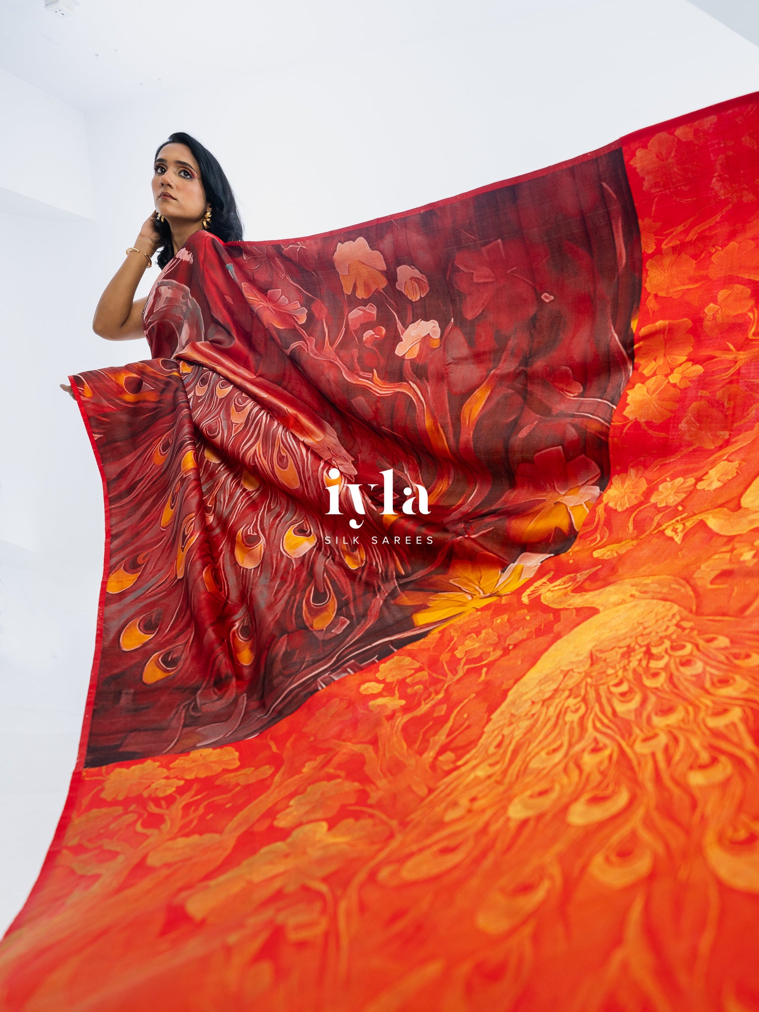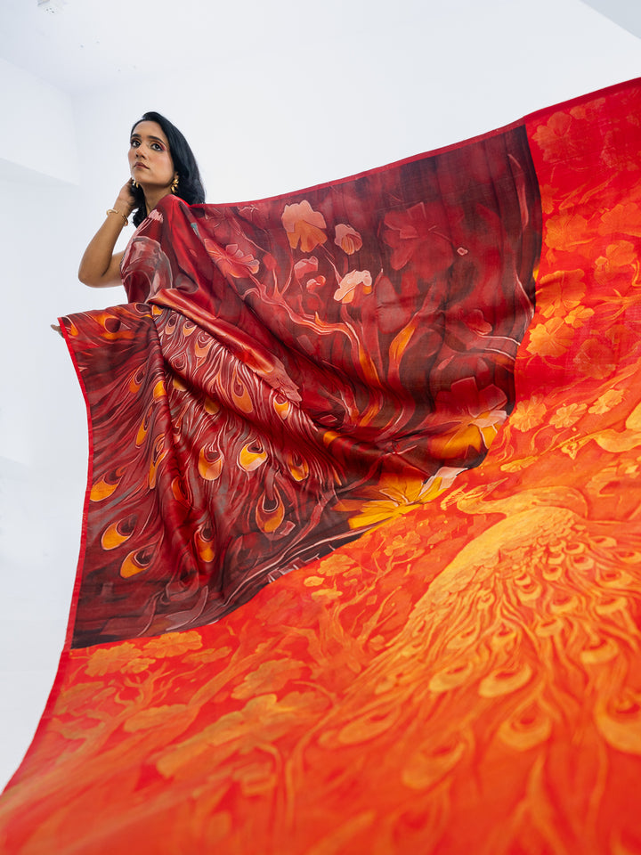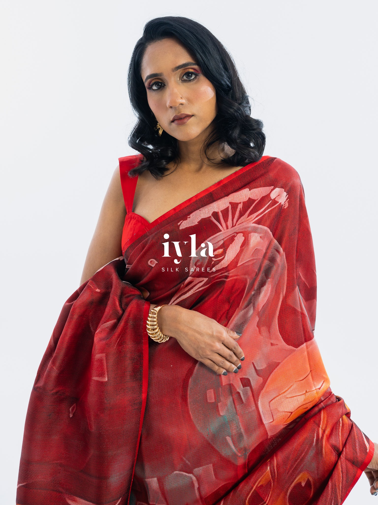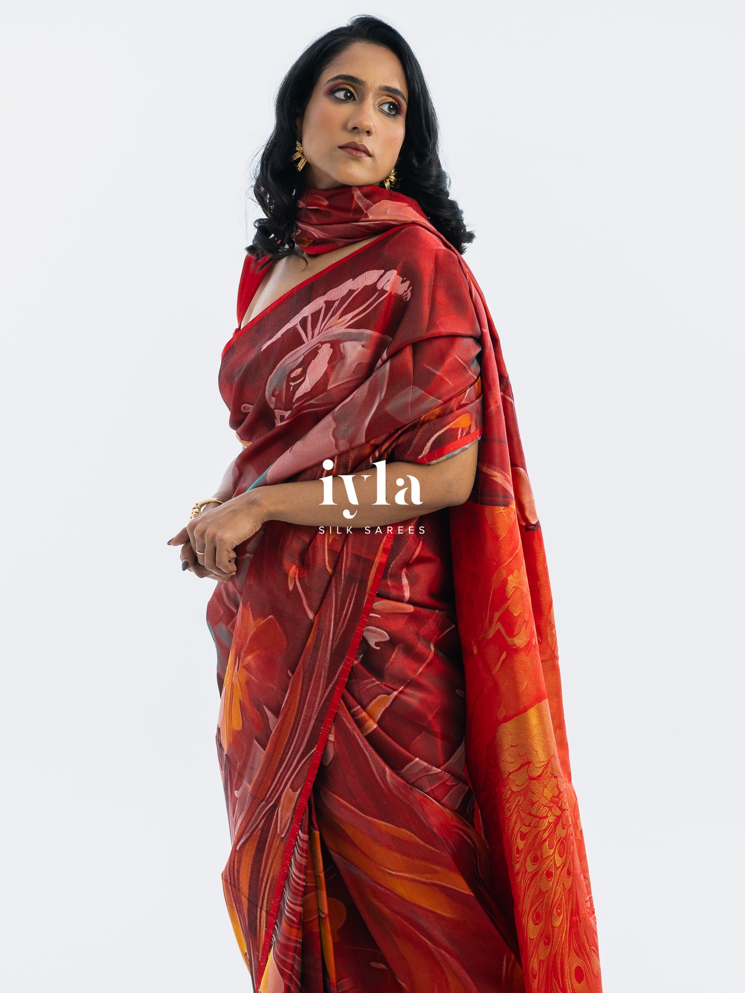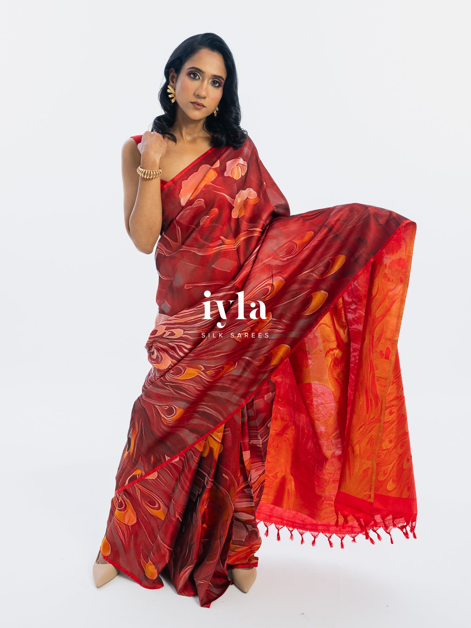 The result is bold, artistic, and unforgettable a saree that transforms the wearer into the very embodiment of regal presence.