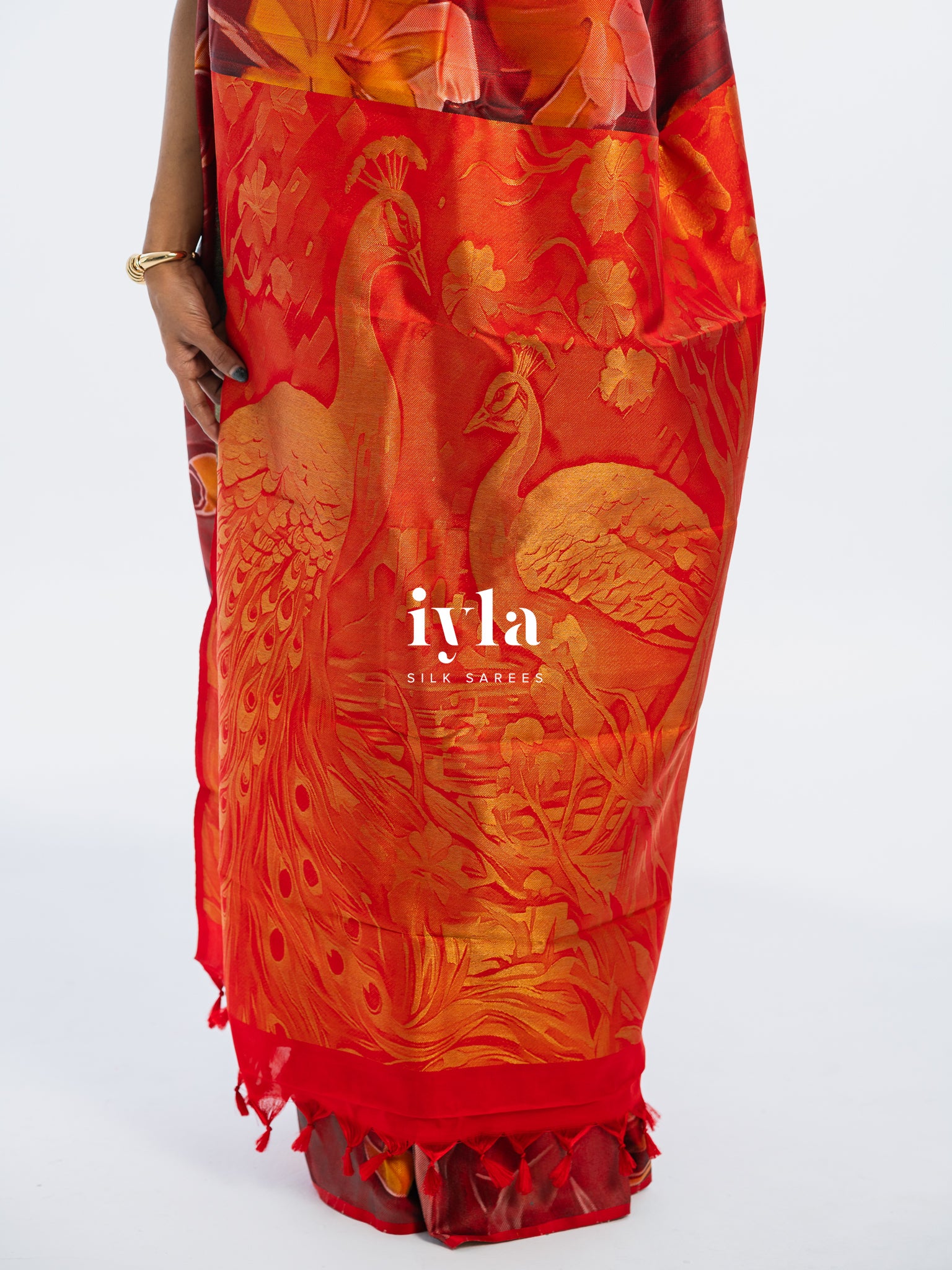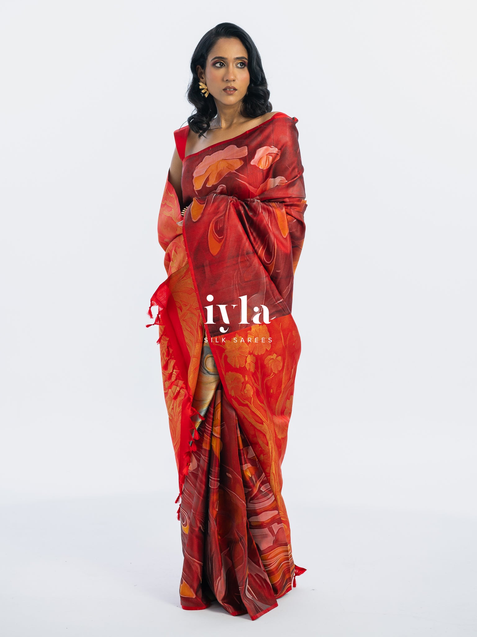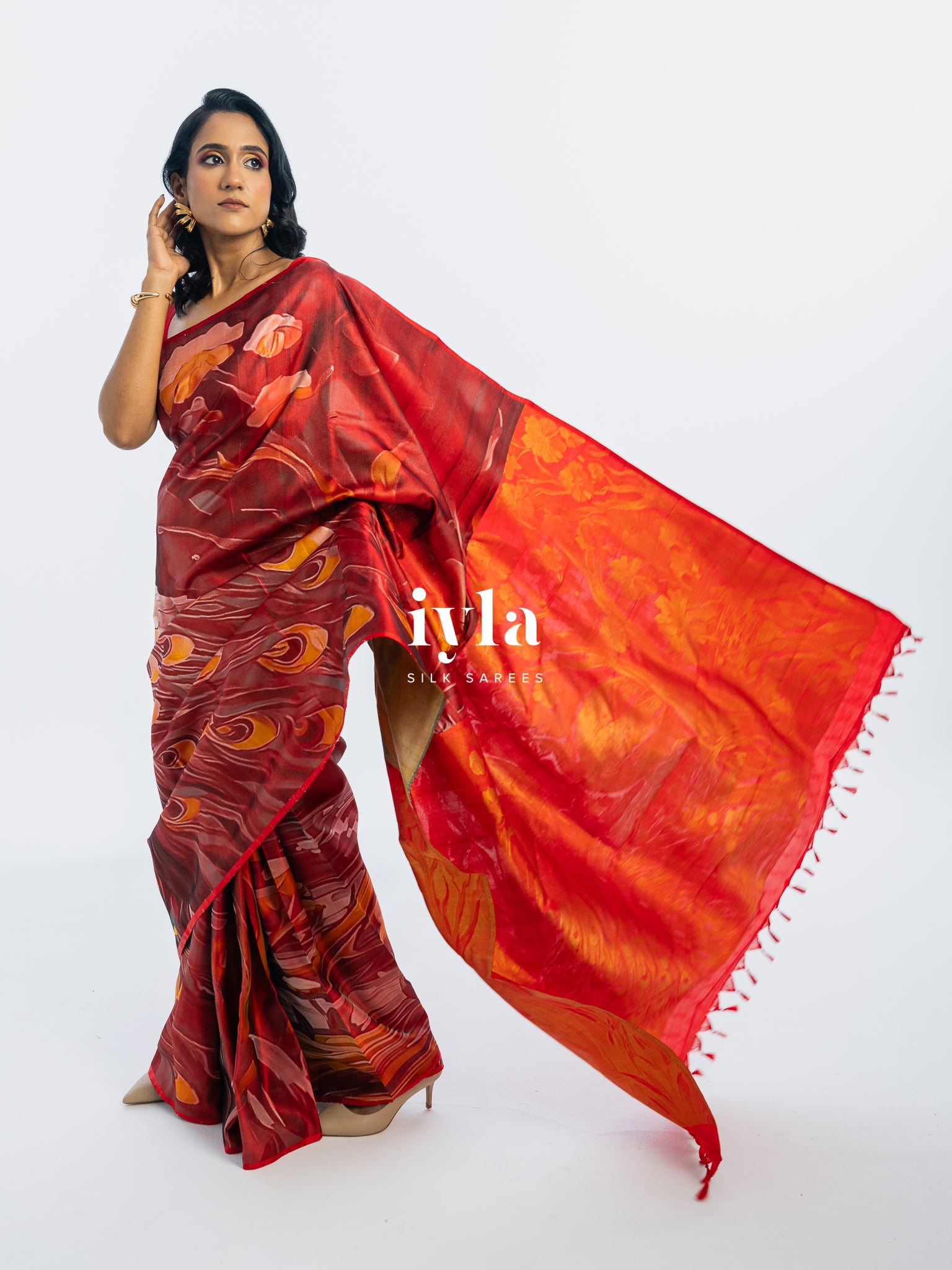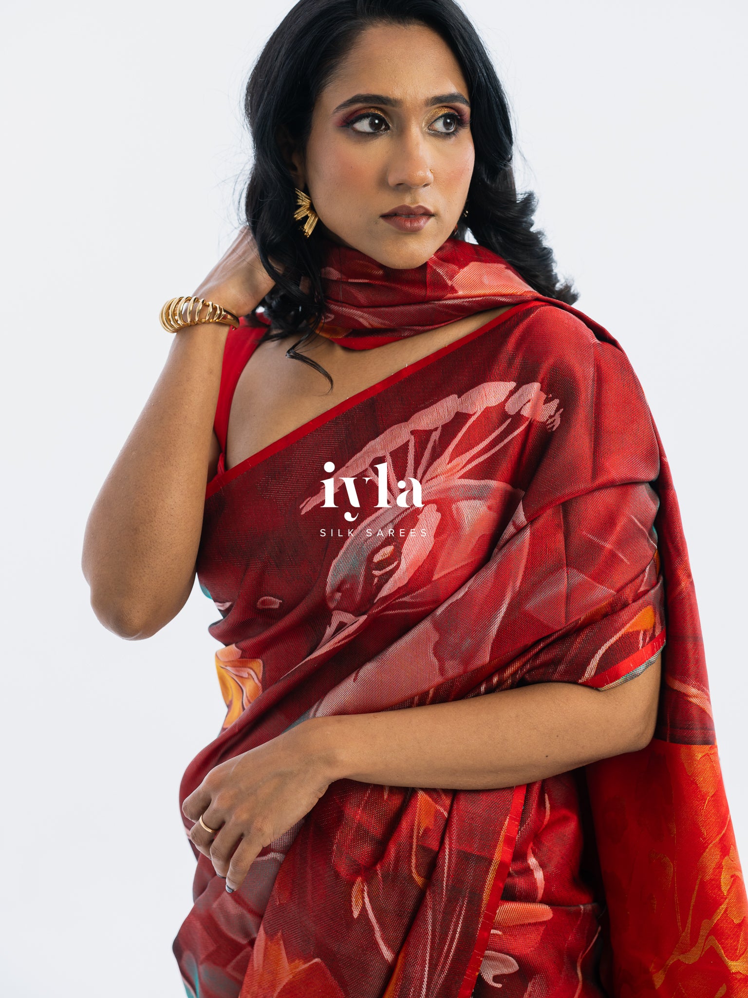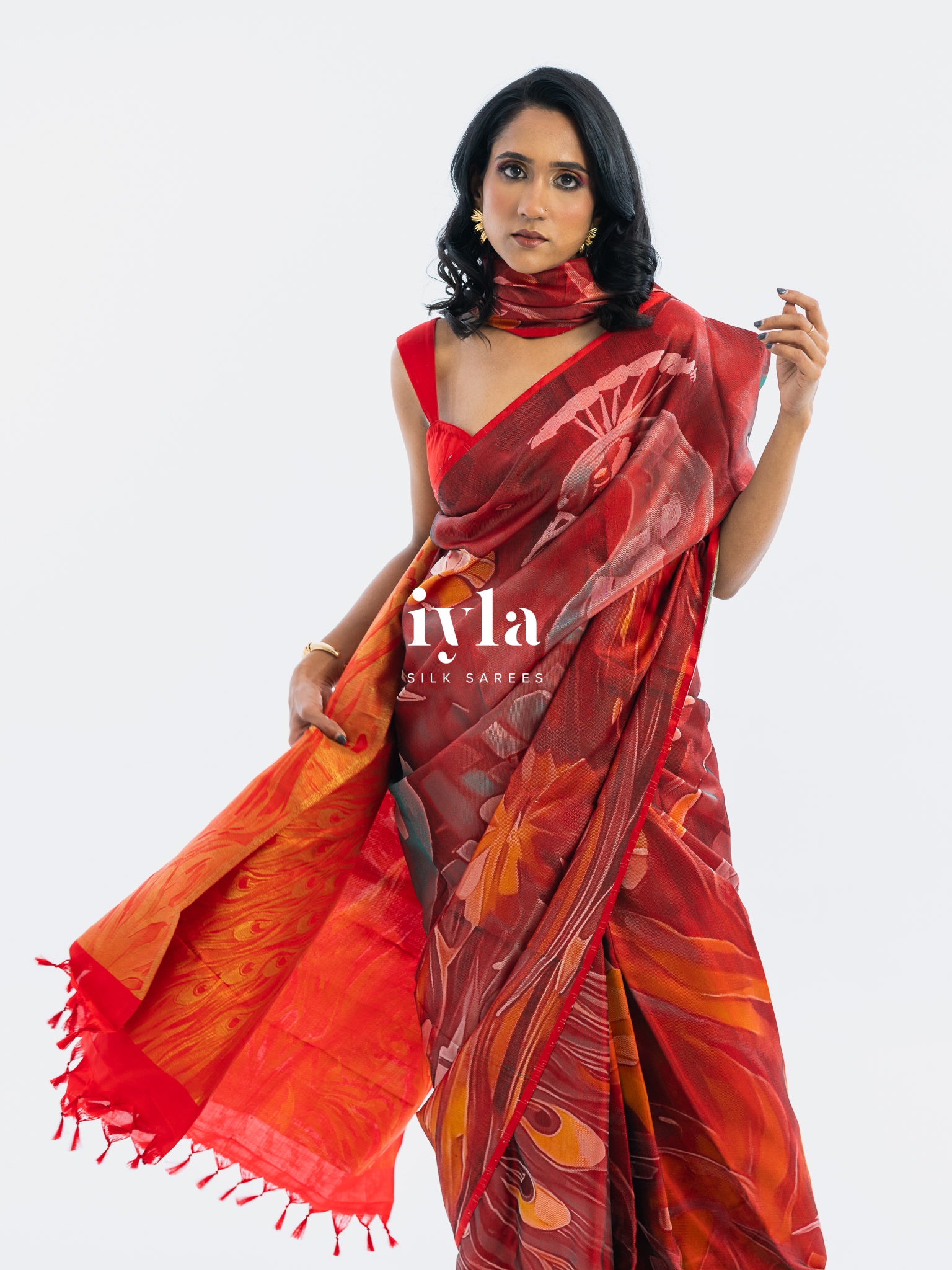 The result is bold, artistic, and unforgettable a saree that transforms the wearer into the very embodiment of regal presence.