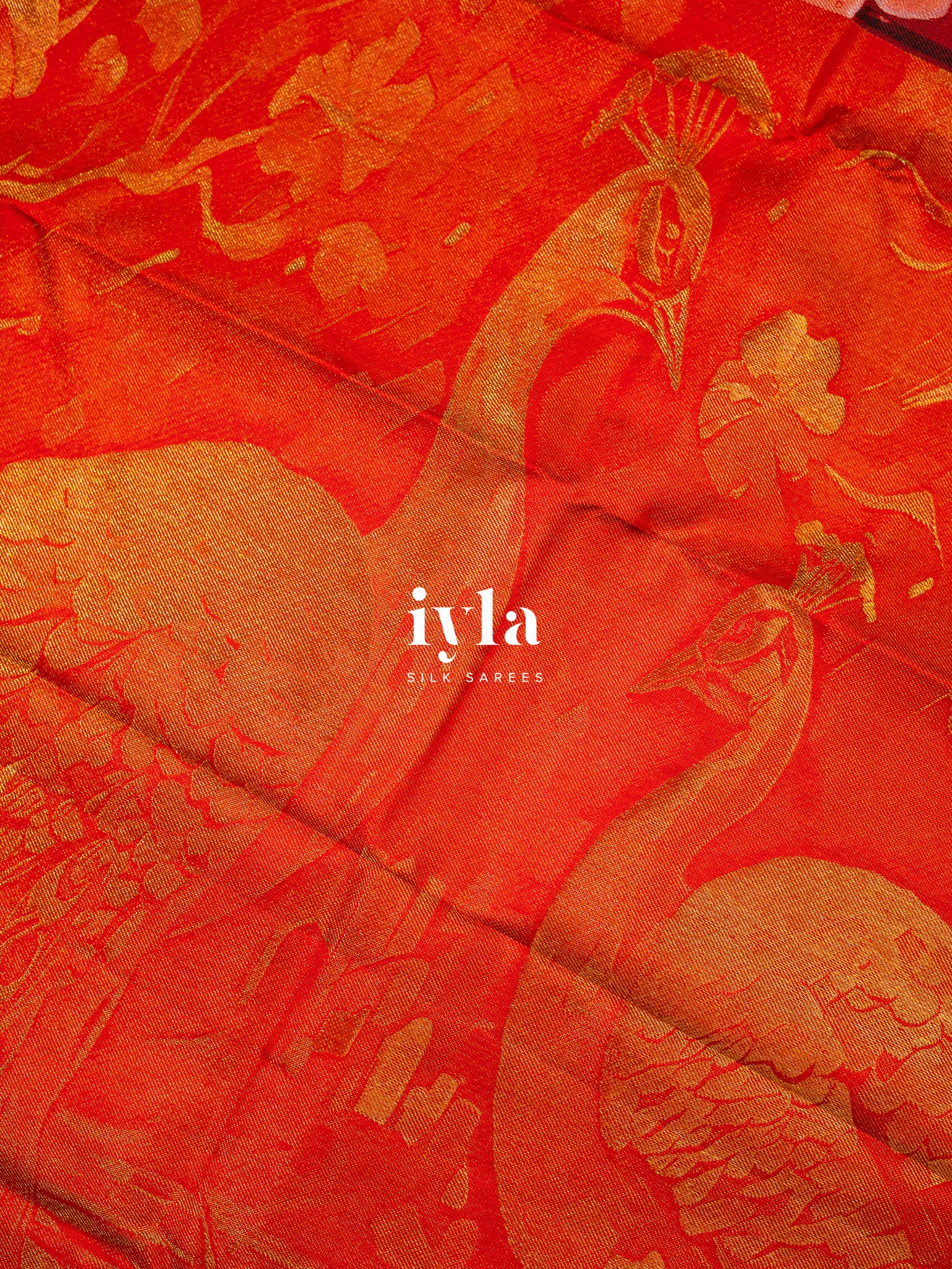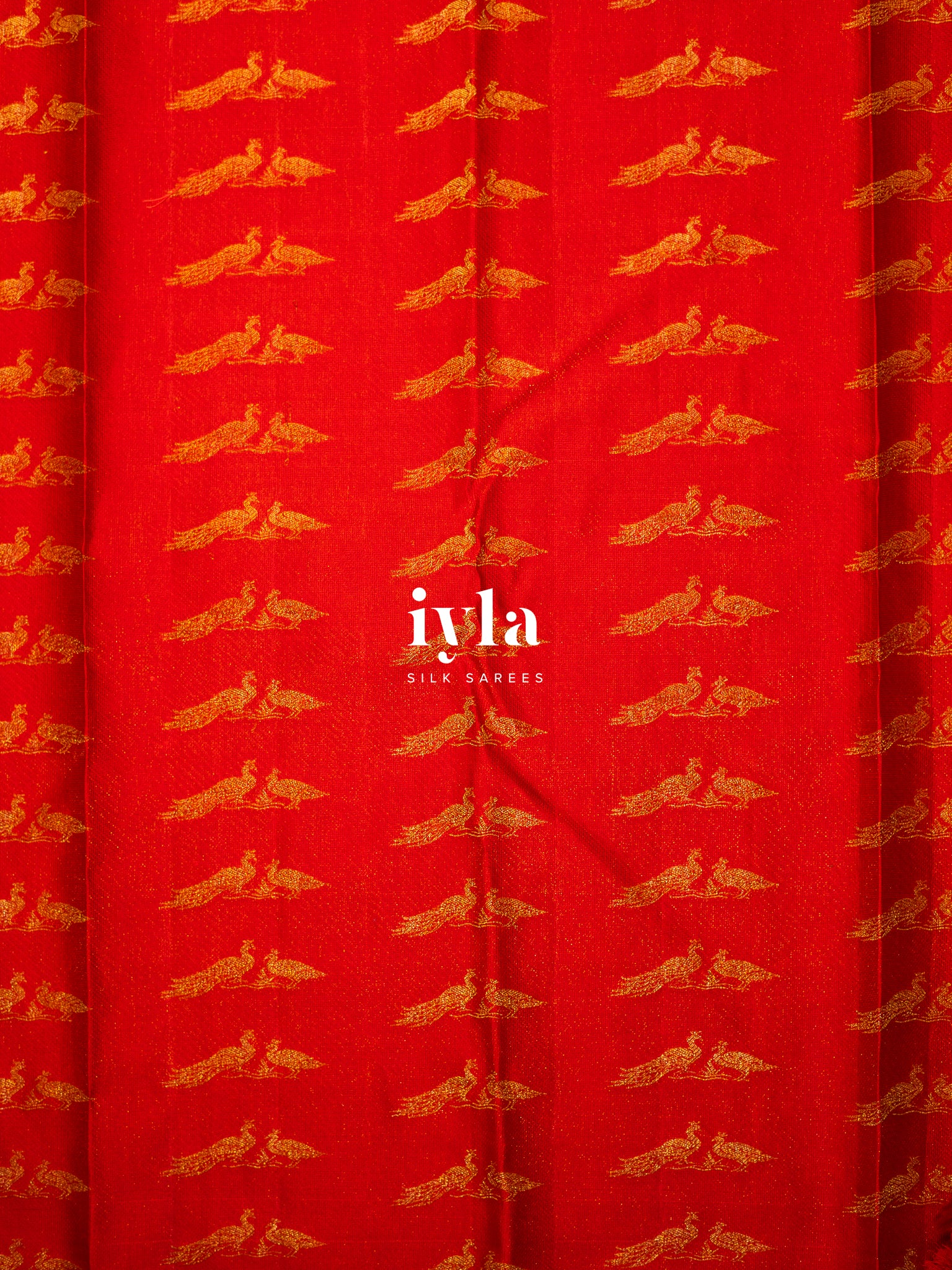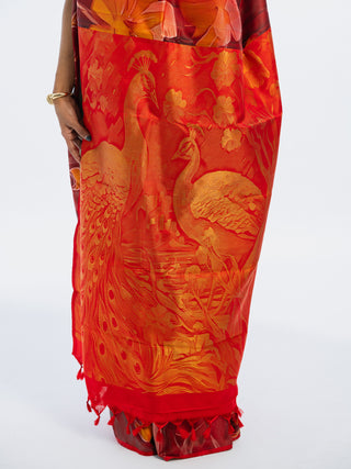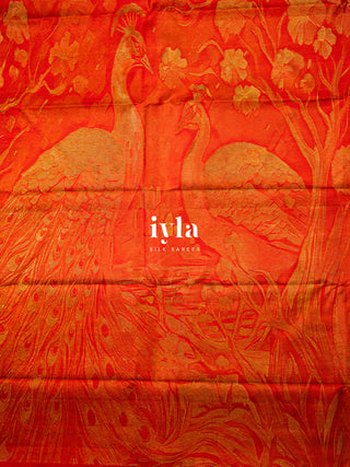 The pallu unfolds like a sacred forest scene. Two magnificent peacocks stand poised, their resplendent feathers fully spread in regal symmetry. The detailing in rich gold zari brings life, texture, and movement to every plume, creating a luminous play of light as you move.