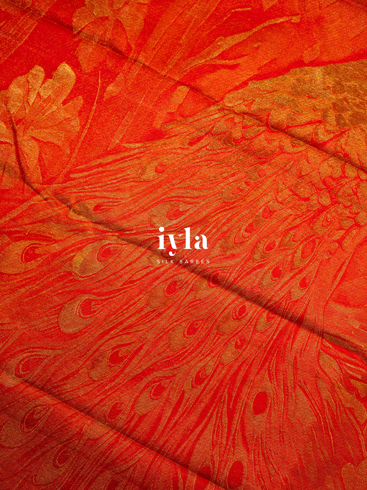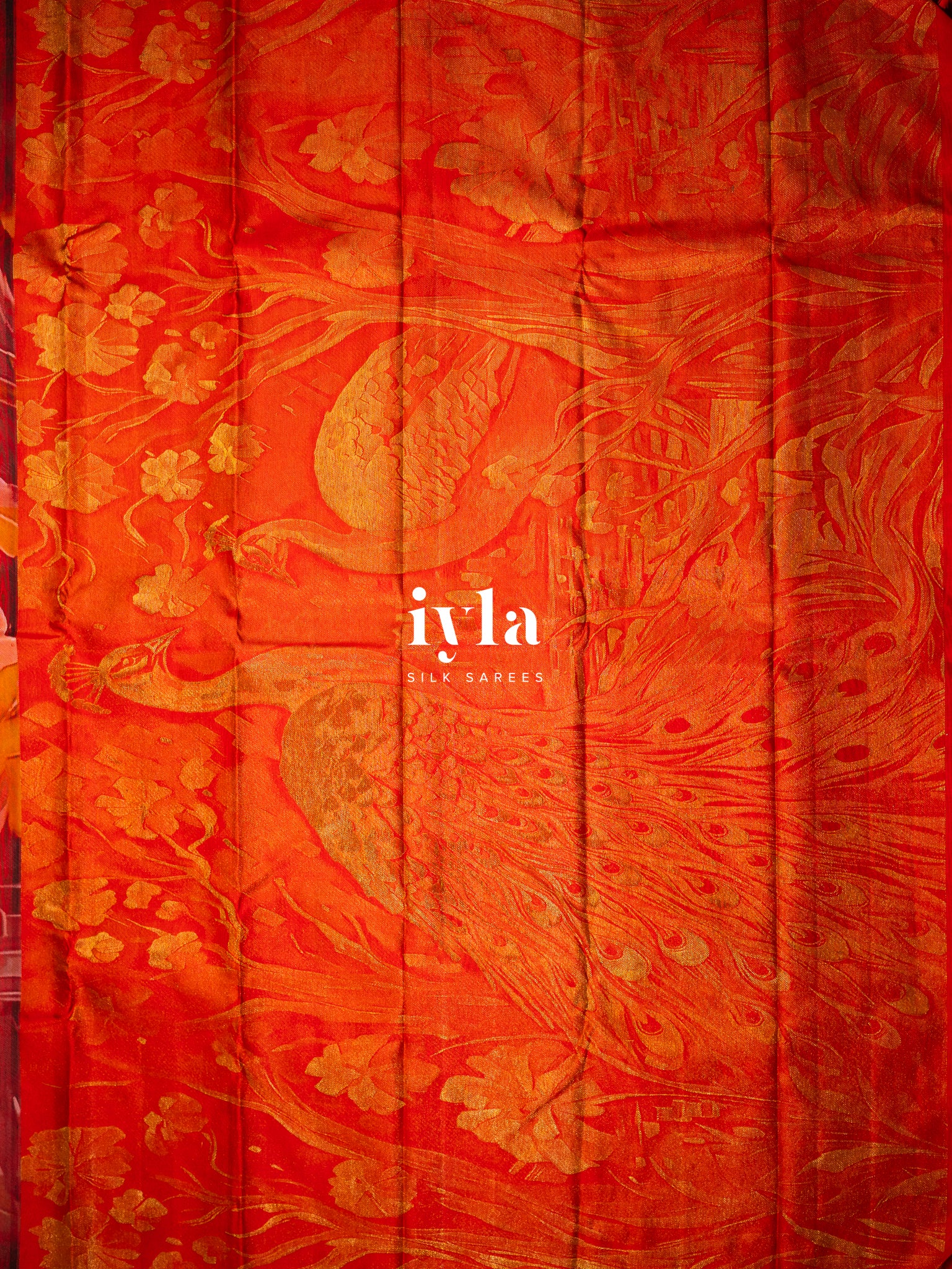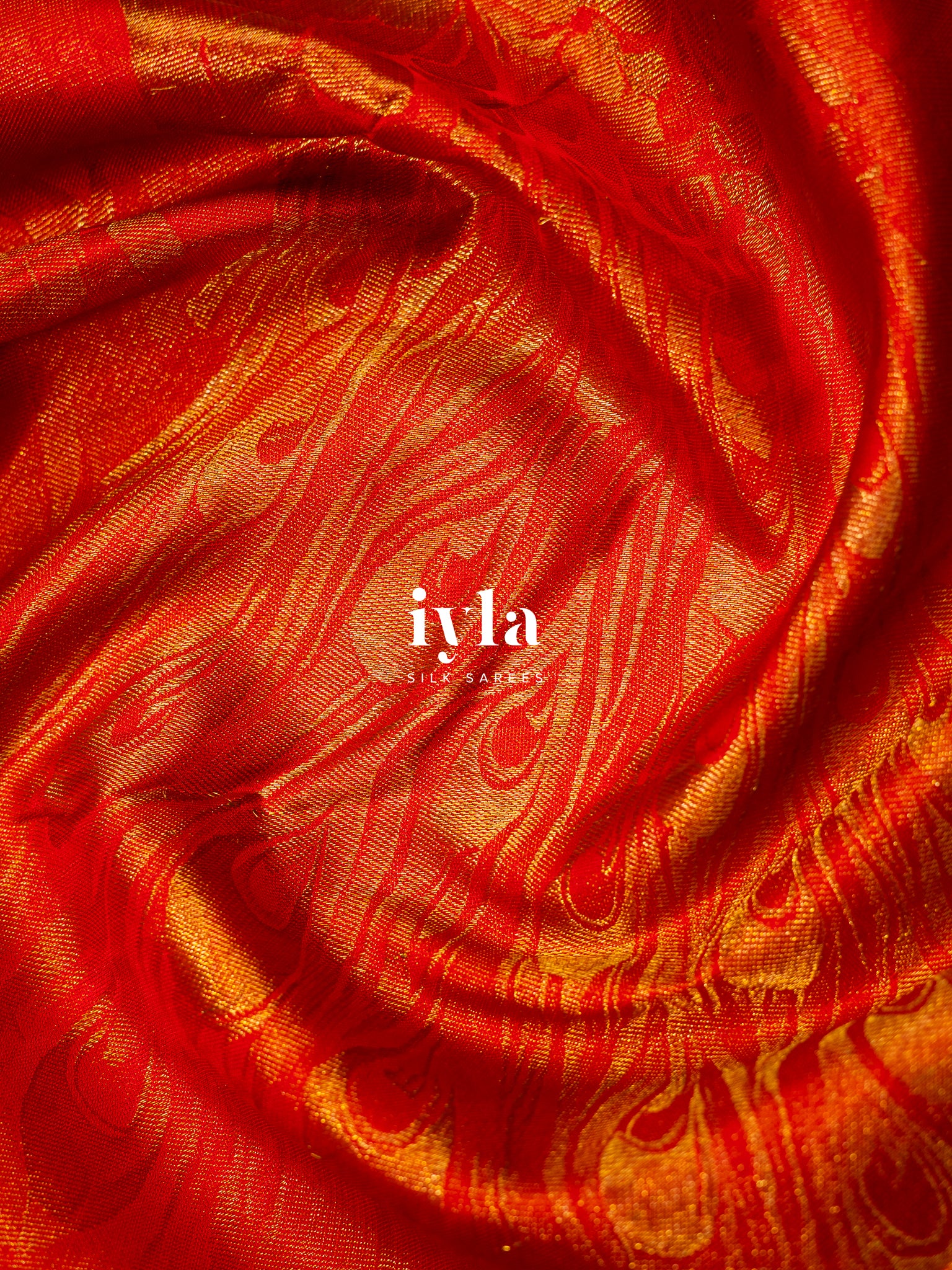The pallu unfolds like a sacred forest scene. Two magnificent peacocks stand poised, their resplendent feathers fully spread in regal symmetry. The detailing in rich gold zari brings life, texture, and movement to every plume, creating a luminous play of light as you move.
